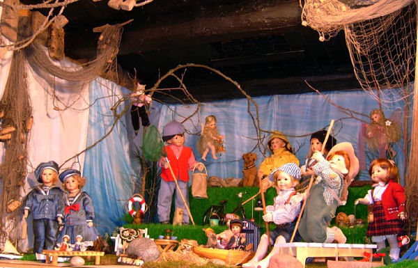 Tässä vitriinissä olevat lampaat ja koirat ovat tunnetun vanhan saksalaisen pehmolelutehtaan (Steiff) tuotantoa. Ne tehdään yksilöllisesti ja käsin. Näyttelyssä olevat yksilöt ovat vanhempaa tuotantoa.