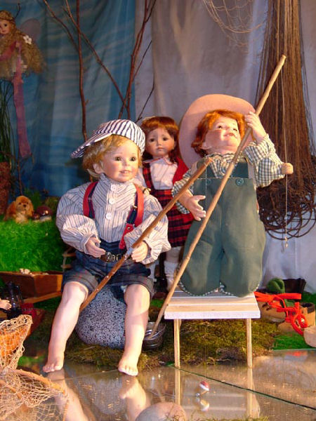 Tässä vitriinissä olevat lampaat ja koirat ovat tunnetun vanhan saksalaisen pehmolelutehtaan (Steiff) tuotantoa. Ne tehdään yksilöllisesti ja käsin. Näyttelyssä olevat yksilöt ovat vanhempaa tuotantoa.